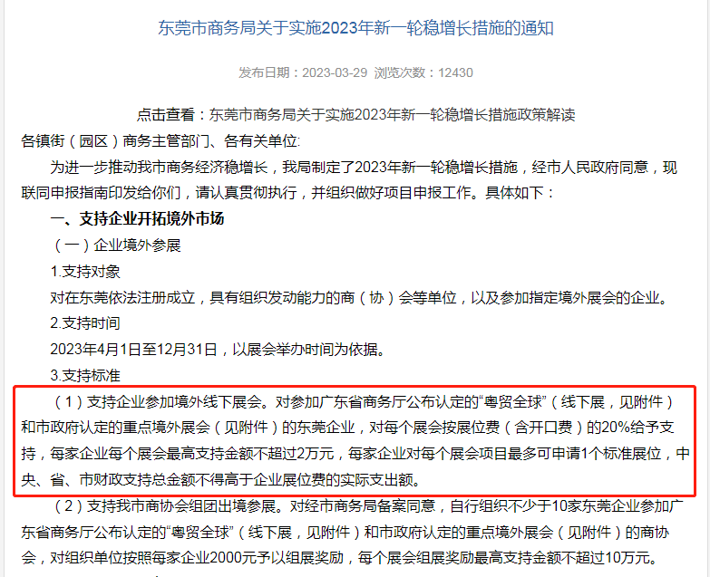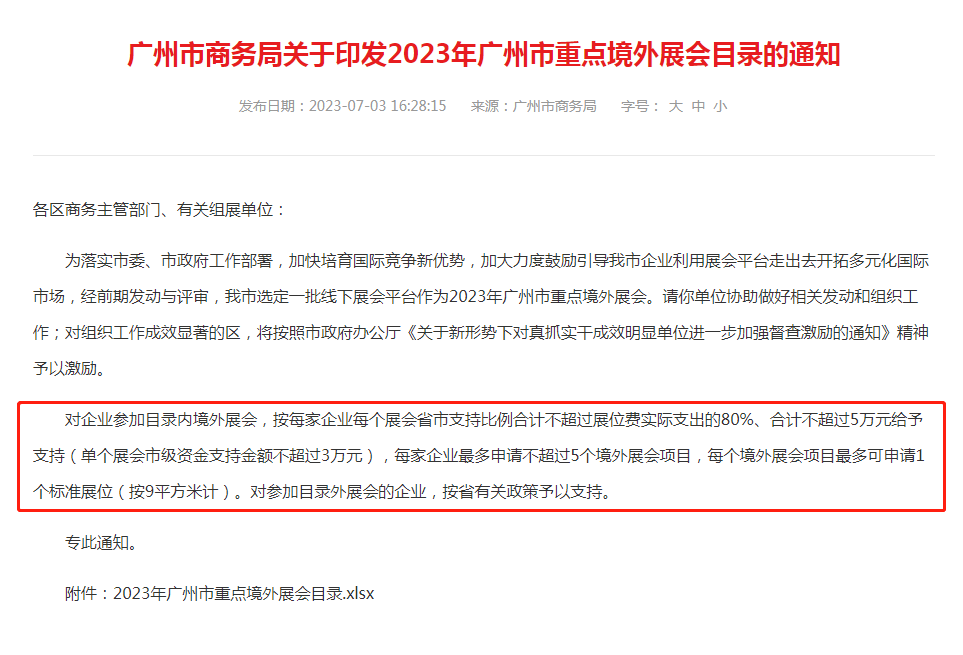 近期,为了开拓境外市场、培育国际竞争新优势、实现经济稳增长,广东省商务厅、东莞市商务厅、广州市商务厅相继出台相关企业参展扶持政策,给予参加指定重点境外展会的参展企业一定的资金支持,更大力度鼓励及引导企业利用展会平台走出去开拓多元化国际市场,推进我国对外贸易高质量发展。