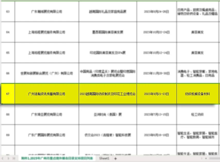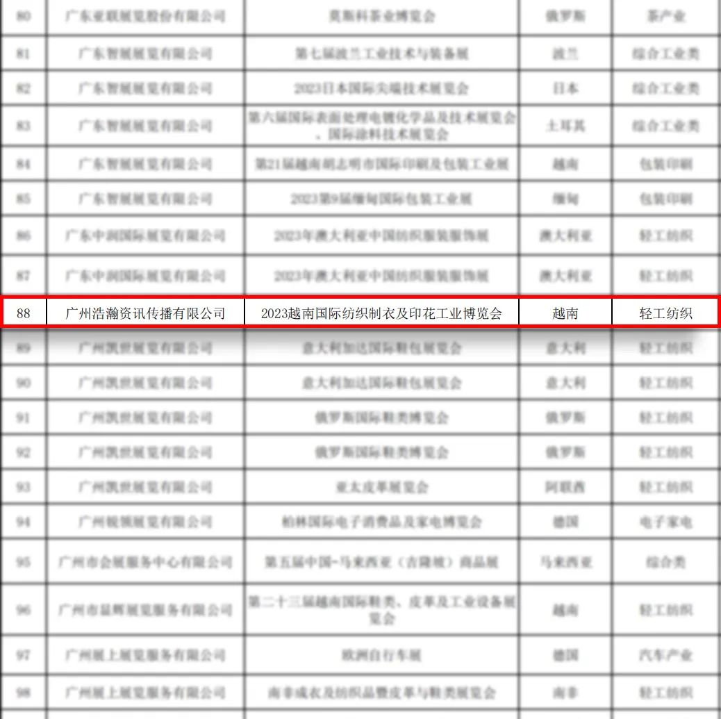 在广东省商务厅、东莞市商务厅、广州市商务厅所指定的境外线下展会中,2023越南国际纺织制衣及印花工业博览会作为浩瀚资讯在越南的优质展会成功入选。