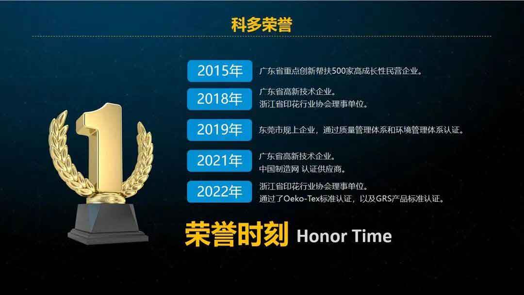 科多公司在不断提升制造能力的同时,也相应建立了完整的品质管控体系,从原材料来料检验到制程快检,再到成品检验,确保产品完全符合国家标准或行业标准,并细化成科多内部标准,公司顺利通过了ISO9000和ISO14000系列的体系认证,以及OEKO-TEX(L3)认证、GRS认证等,是国家高新技术企业。