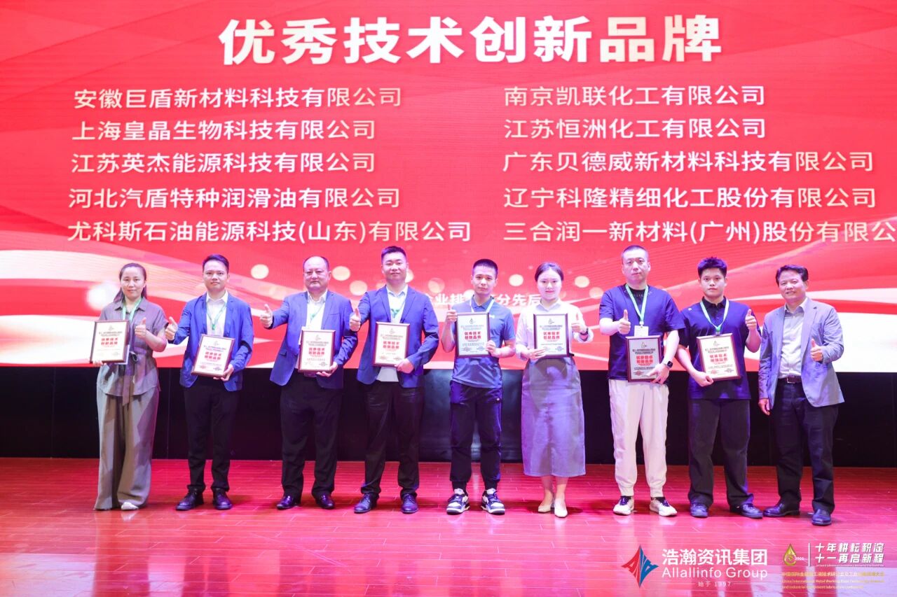接下来是——优秀技术创新品牌,获奖企业分别是:安徽巨盾新材料科技有限公司、南京凯联化工有限公司、上海皇晶生物科技有限公司、江苏恒洲化工有限公司、江苏英杰能源科技有限公司、广东贝德威新材料科技有限公司、河北汽盾特种润滑油有限公司、辽宁科隆精细化工股份有限公司、尤科斯石油能源科技(山东)有限公司和三合润一新材料(广州)股份有限公司。