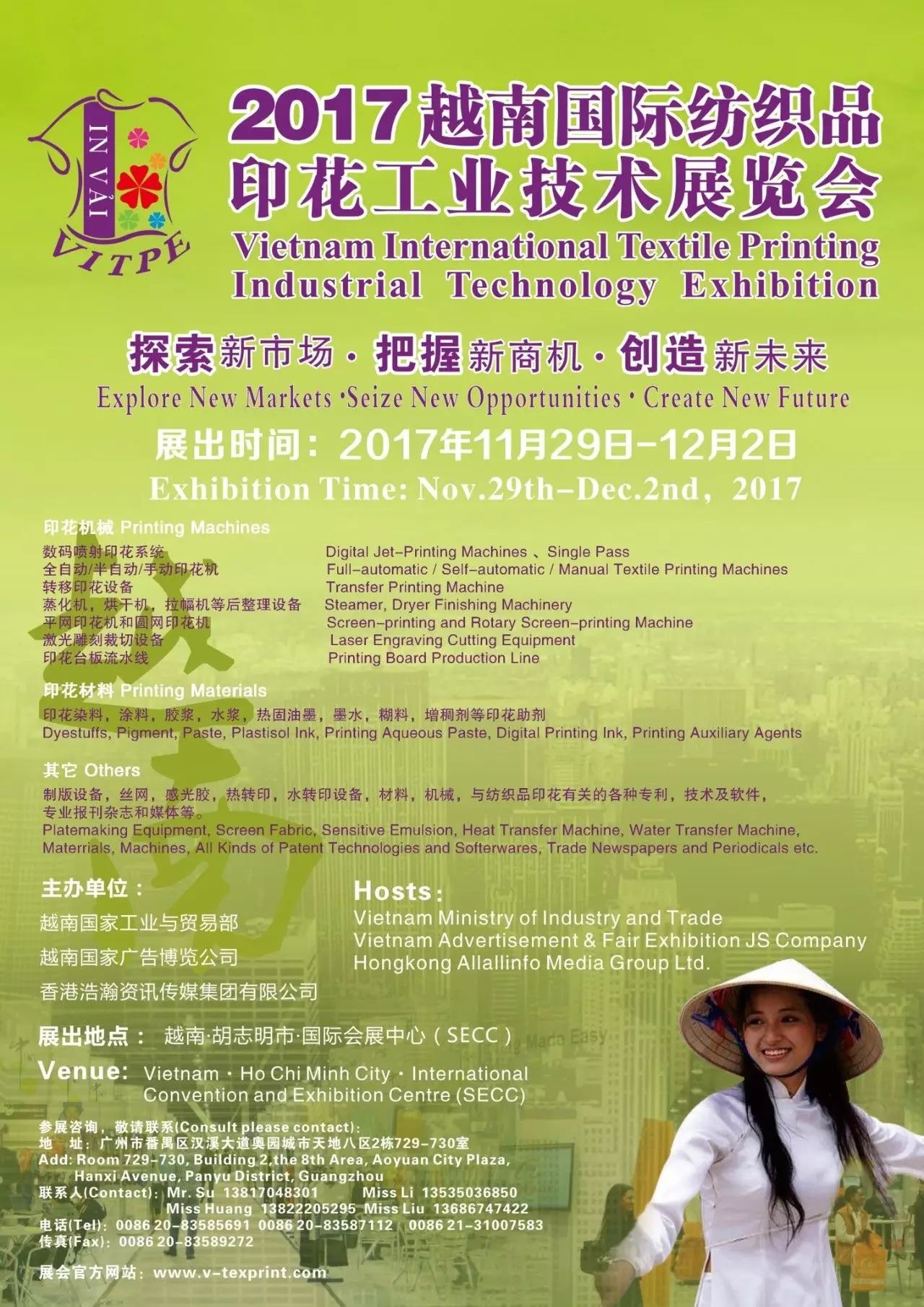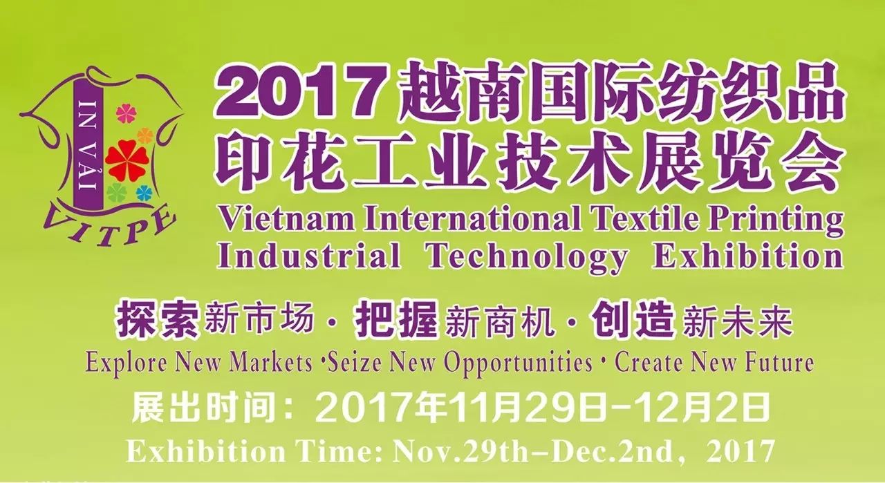 2017越南国际纺织品印花工业技术展览会(2017 Vietnam International Textile Printing Industrial Technology Exhibition)将于今年11月29日至12月2日举行。届时各生产商、进出口商将前来参展并介绍纺织服装产业价值链。该展会符合越南纺织服装企业扩大对外交往、寻求国际合作和拓展市场等需求。通过此展,越南企业可优化货源供应和接触到东盟和其他国家的绿色技术和新产品等。