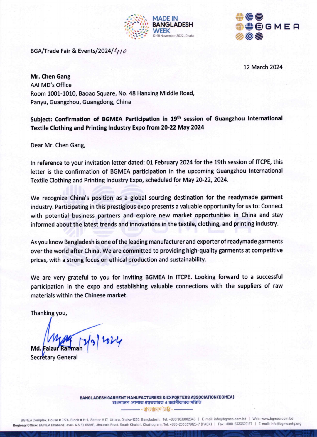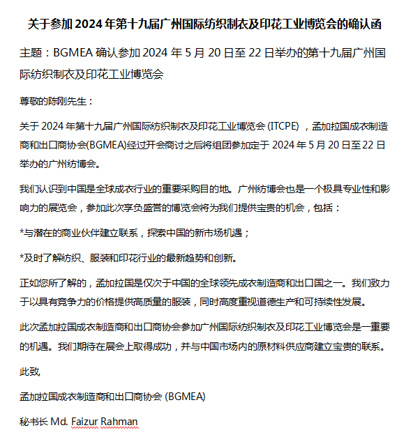 孟加拉国成衣制造商和出口商协会(BGMEA)的组团公函: