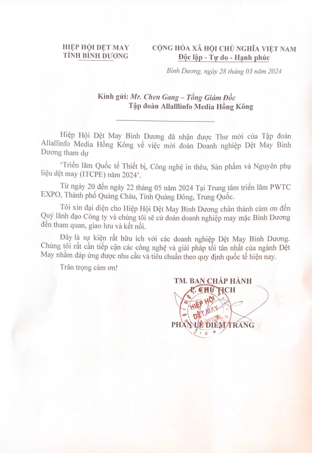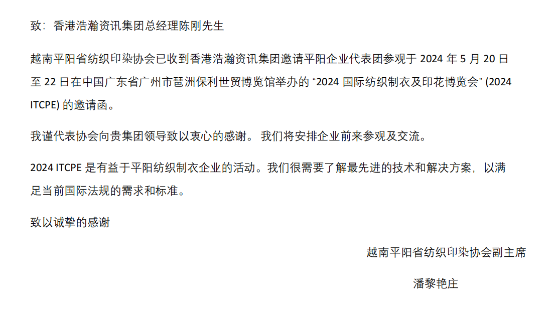越南平阳省纺织印染协会的组团公函: