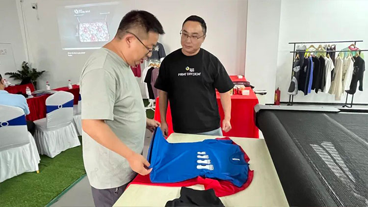 随后,康丽战略客户总监钟宇路先生详细介绍了康丽数码印花技术的显著优势。该技术无需前后整处理,一步到位,且一种墨水即可覆盖所有面料,大大提高了生产效率和灵活性。其独特的水性涂料湿打专利技术,在DTG(成衣直喷)与DTF(匹布直喷)产品线中独树一帜,不仅提升了印花的色彩鲜艳度与牢度,更在环保与可持续性方面树立了行业标杆。