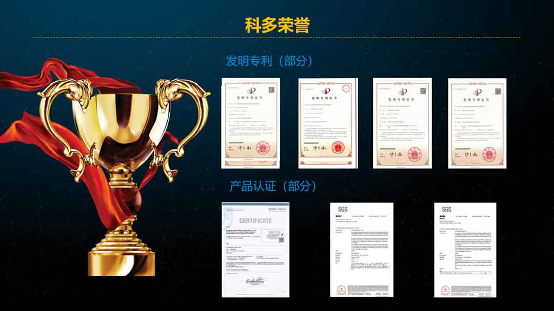 多年来,科多公司坚持着“以人为本、科技兴企”的发展观,通过培养和引进,建立了一支素质高、业务精、能力强的专业队伍。技术上,取得了多项国家发明专利;管理上,强化制度建设和体系建设,不断提升产品品质和生产效率。