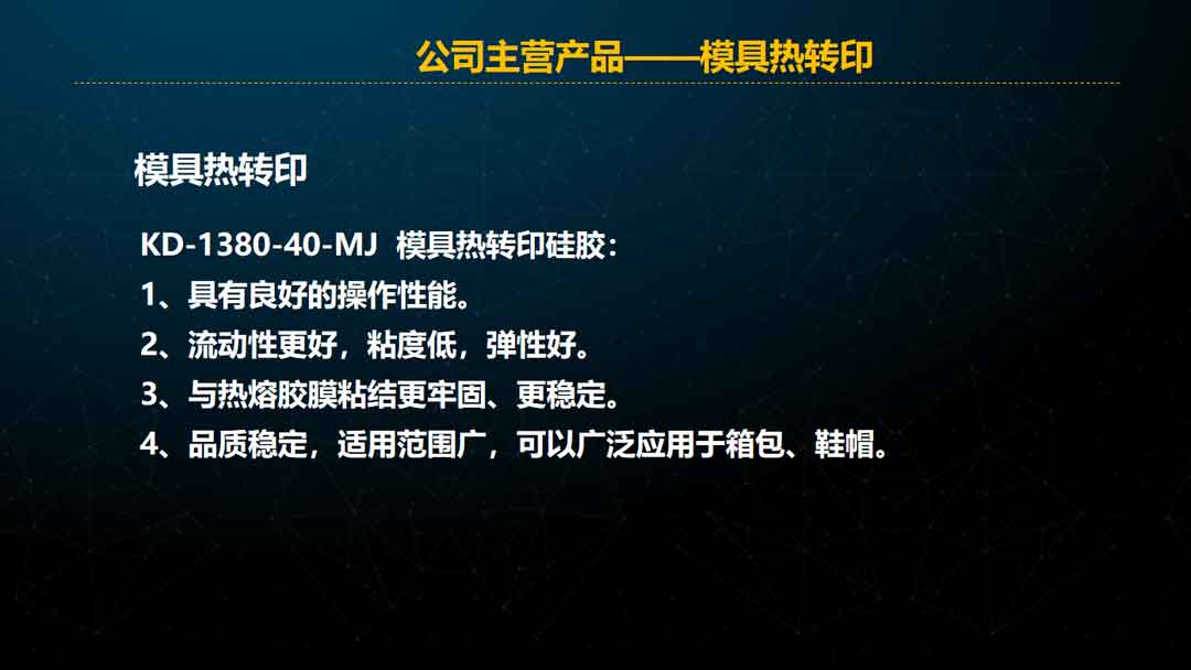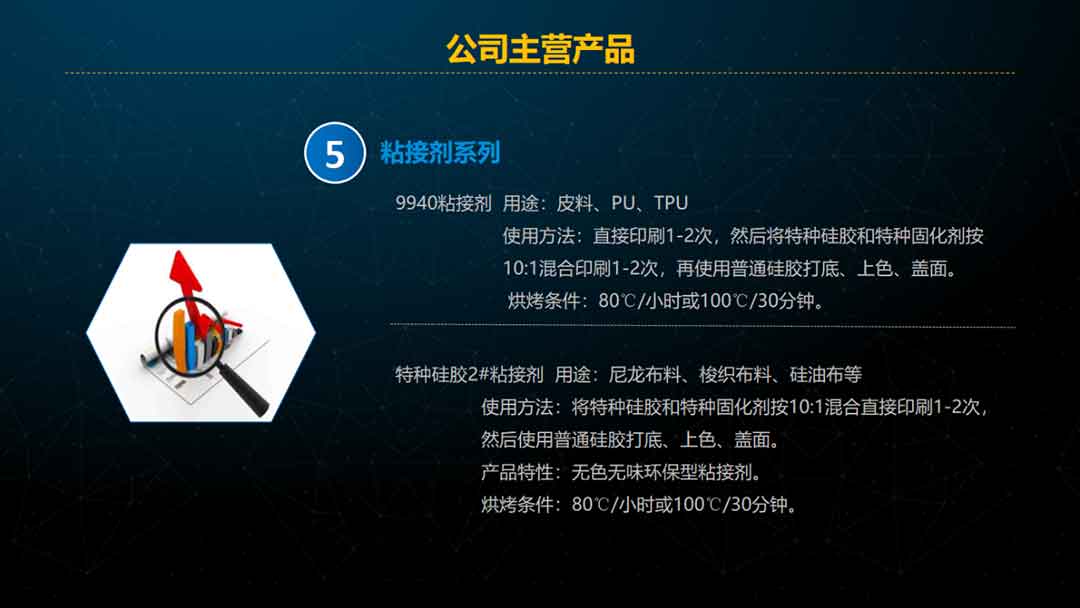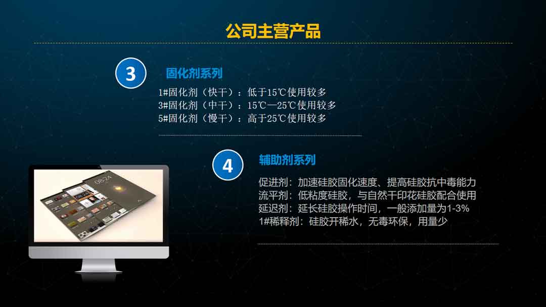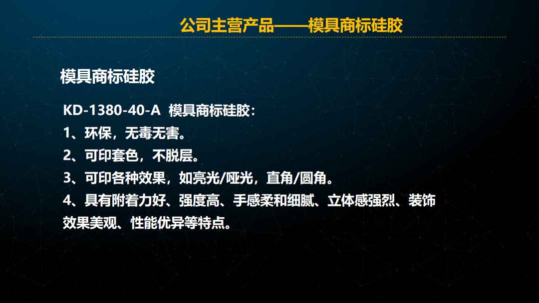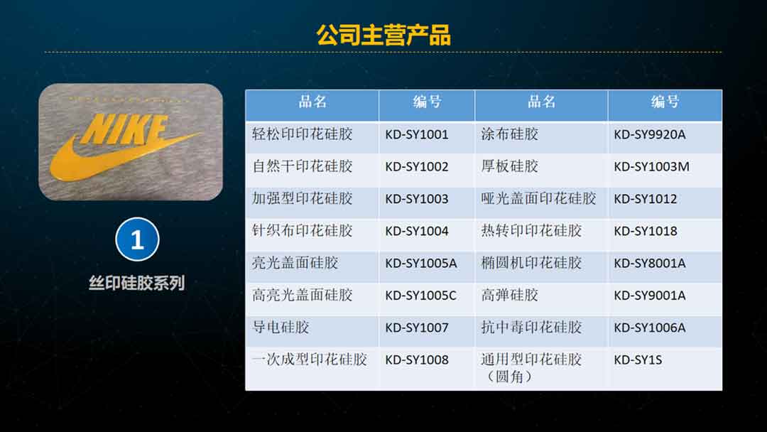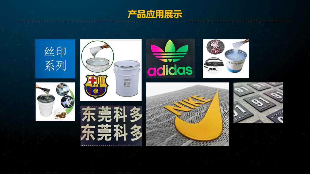 经过近二十多年的成长和经营,科多公司拥有了铂金催化剂、硅油、基胶、LSR、HTV全套生产技术,产品系列涵盖丝印硅胶、热转印硅胶及配套材料、丝印助剂、丝印粘接剂、凹凸丝印硅胶、商标硅胶、压花硅胶、袜子硅胶、硅凝胶、单组分滴胶、单组分丝印胶等,并具有为客户量身定制产品的能力。