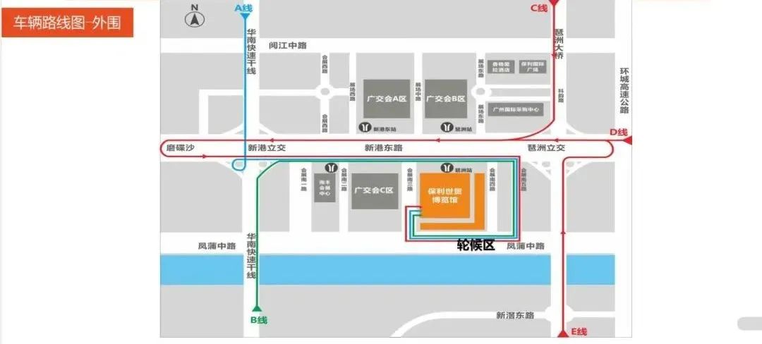 A线、B线(华南快速干线)开至新港东路(西往东方向)经由会展南五路右转至凤蒲中路进入保利展馆卸货区。