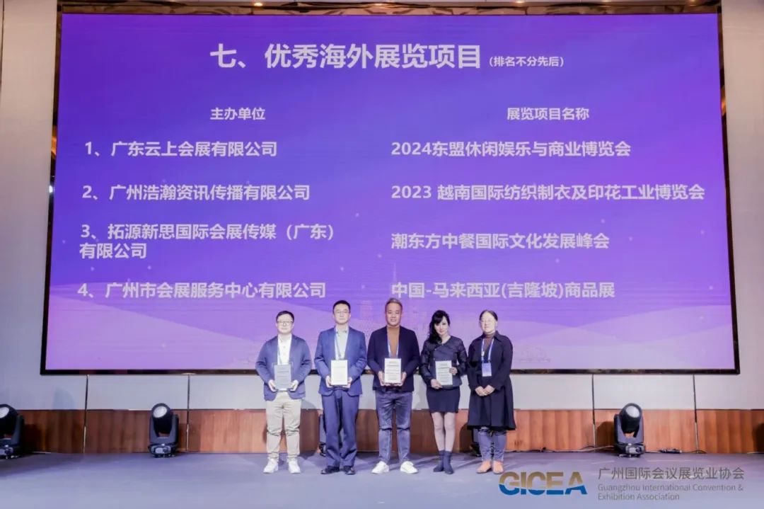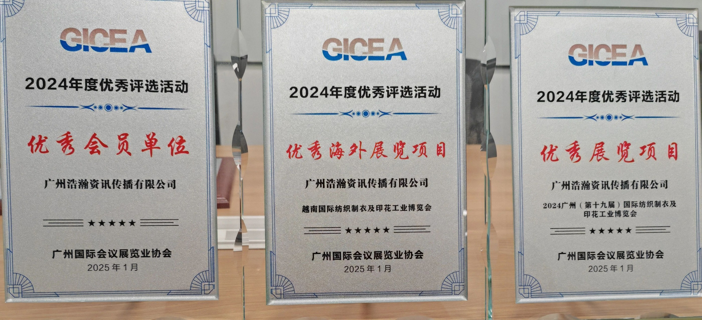 更值得一提的是,在2024年度广州国际会议展览业协会评优表彰活动中,我司凭借卓越的贡献和出色的表现,获得了“2024年度优秀会员单位”称号。同时,由我司主办的“2024广州(第十九届)国际纺织制衣及印花工业博览会”和“越南国际纺织制衣及印花工业博览会”也分别荣获“GICEA2024优秀展览项目”和“GICEA2024年度优秀海外展览项目”奖项。这些荣誉的获得,不仅是对我司在会展业领域深厚实力和良好口碑的充分展示,更是对公司长期以来坚持创新、追求卓越精神的肯定。