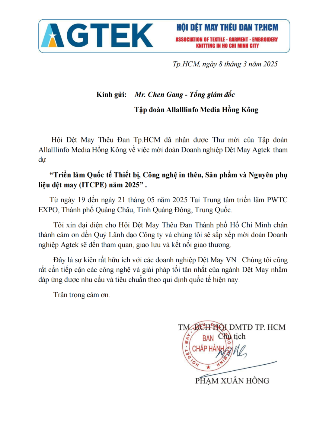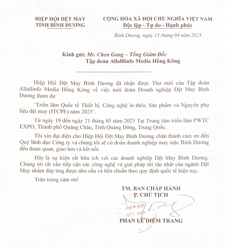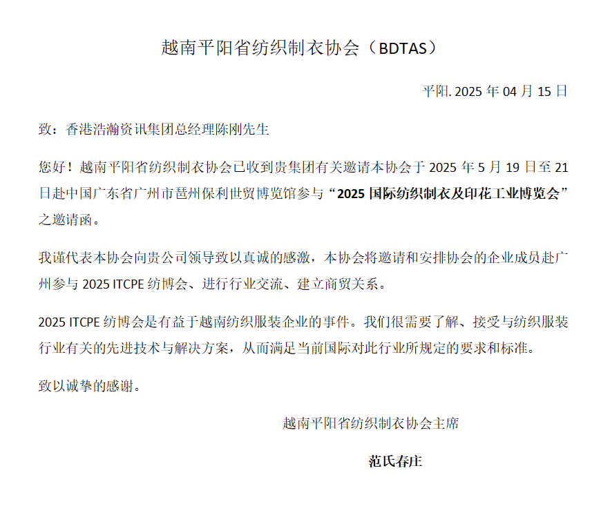 越南平阳省纺织制衣协会参观团赴会确认书