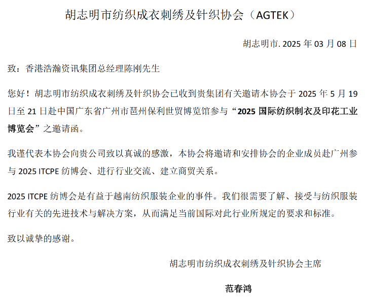 胡志明市纺织成衣刺绣及针织协会参观团赴会确认书